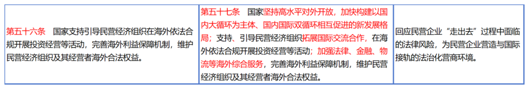 在对外开放方面,《促进法》新增“加强海外综合服务和权益保护”条款,回应了民营企业“走出去”过程中面临的法律风险。